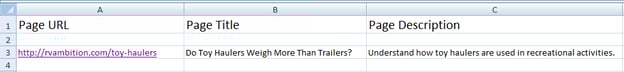 In addition to crawling your site and all the pages, you’ll need to export all the results into an Excel (or .csv) file. You’ll create three key columns of data to help you simplify the entire process.