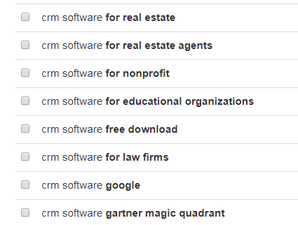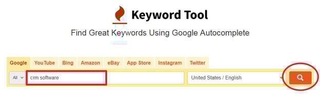 With these handy tool, I can enter my main keyword (e.g., crm software) into the search box and I’ll get a list of 1,000+ keyword variations. In this example, I’m using the KeywordTool.io software: