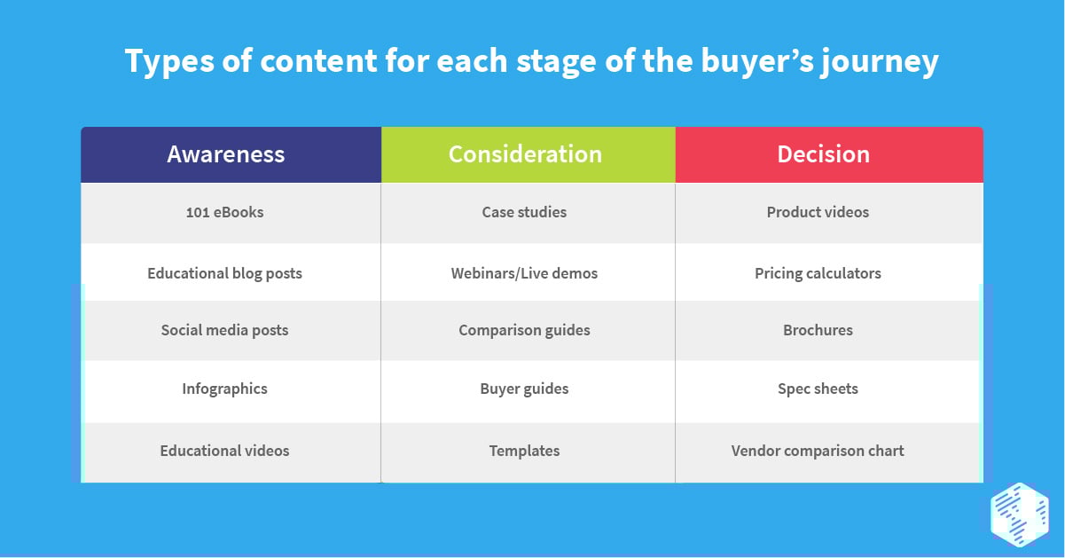 When creating educational content, keep in mind the buyer’s journey. For an effective marketing campaign, you need to provide relevant content for each stage of the buyer’s journey. Here are some content ideas to consider:
