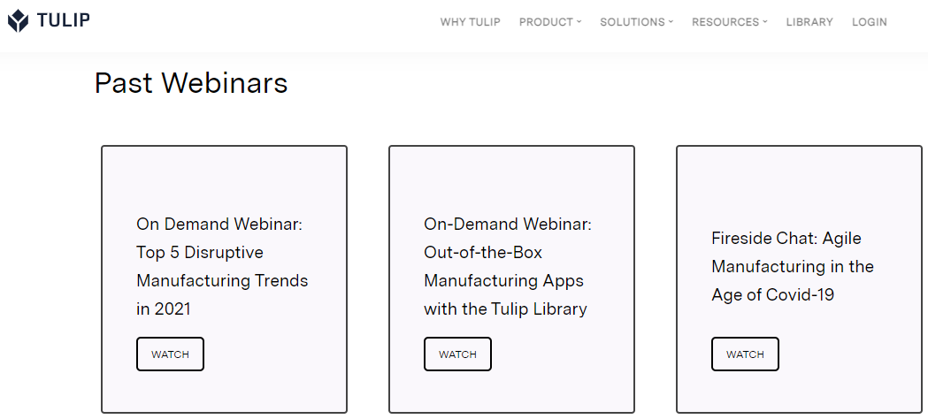 - Consideration stage: Case studies, webinars, comparison guides and buyer guides. Tulip holds regular manufacturing webinars featuring subject matter experts and industry leaders