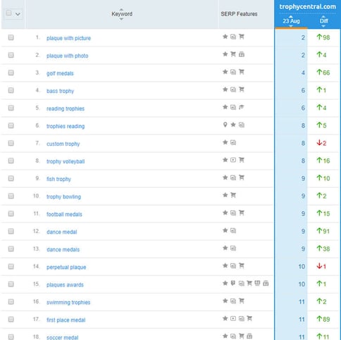 Through the use of internal links and other link placement strategies, Trophy Central, a large eCommerce site, got a Google top 10 position for 9 search terms.