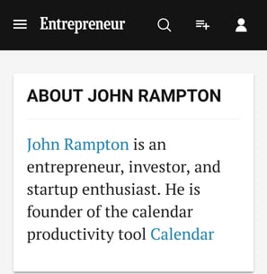 This is an example of John Rampton on Entrepreneur. He links back to his website from his author bio.