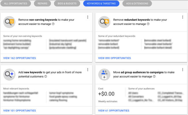 - Keywords & Targeting – These are suggestions that help you reach the right people that are interested in your products and services. Here you’ll see opportunities to add additional keywords, negative keywords, changes to keyword match, and possible tweaks to your poor performing ad groups.