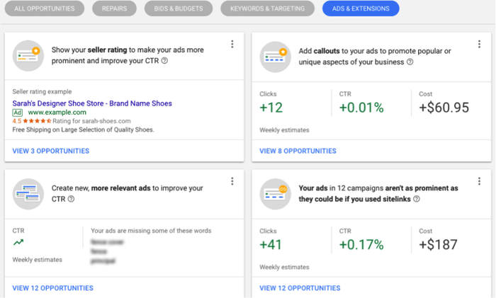 - Ads & Extensions – These are suggestions that work to refine your ads, show the highest performing ads more often, and rearrange ads into stronger ad groups. Here you’ll see opportunities like creating additional ads, ad extensions, ad rotation and optimization.