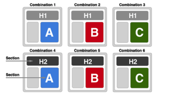Example: In the above example, you are testing two headlines (H1 and H2) and three images (A, B, C) all at the same time. This produces a total of six different combinations (2 headline variants and 3 image variants).