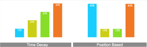 - Time Decay & Position Based – Time Decay assigns more credit to clicks that happened closer in time to the conversion (Credit using a 7 day half life distribution). Position Based assigns 40% to first and last channels and the remaining 20% is spread across the rest.