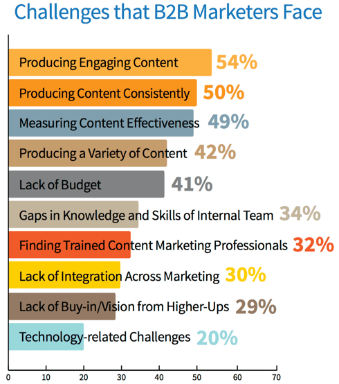 Creating great content is difficult. A study by the Content Marketing Institute reveals that 54% of B2B content marketing campaigns struggle to produce engaging content, while 49% find it difficult to measure their content effectiveness.