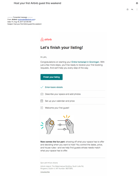For instance, Airbnb’s email campaign first starts with a welcome email which explains to the user what they can expect from subsequent emails.