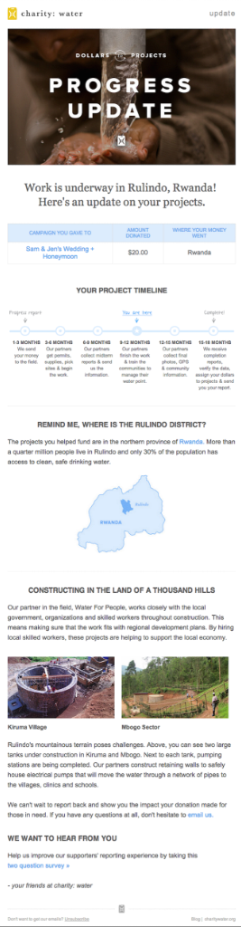 However, what’s unique or impressive about this is that Charity Water uses emails to show donors what their money is achieving per time. Here: