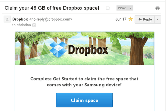 Every email campaign has a goal it should achieve, it could be for downloads or the marketing of a product or service, and so on. The CTA itself could be a link or a button. Dropbox uses a button with the copy “Claim space.”